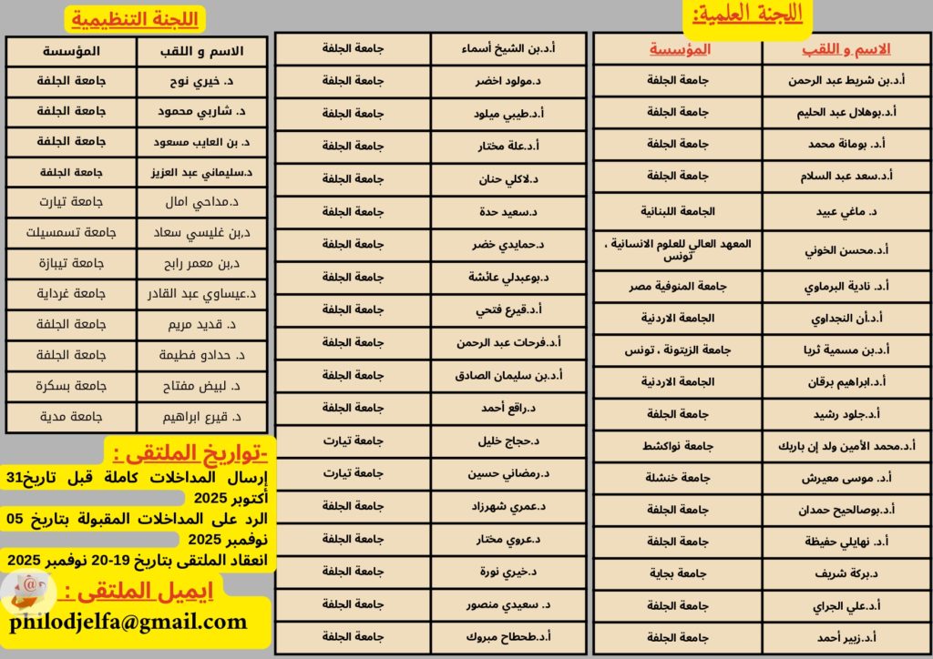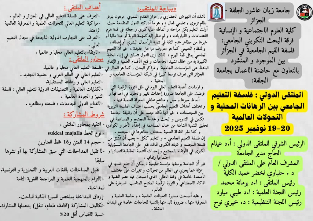الرئيسية/الاعلانات/الملتقى الدولي فلسفة التعليم الجامعي بين الرهانات المحلية والتحولات العالمية: 2025 20-19 نوفمبر