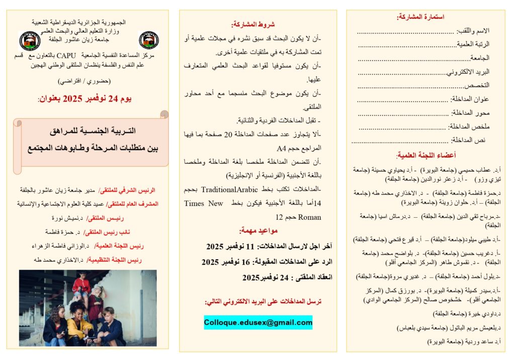 الرئيسية/الاعلانات/إعلان عن ملتقى وطني التربية الجنسية للمراهق بين متطلبات المرحلة وطابوهات المجتمع(حضوري / افتراضي) يوم 24 نوفمبر 2025