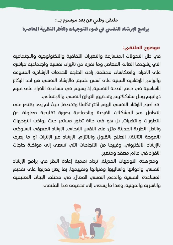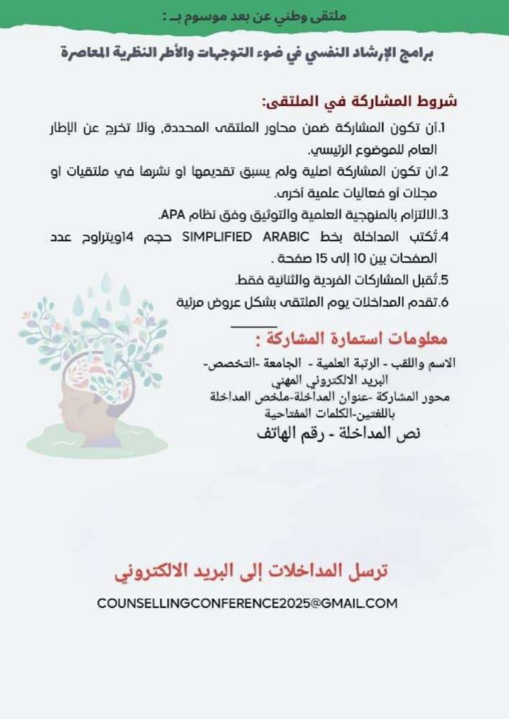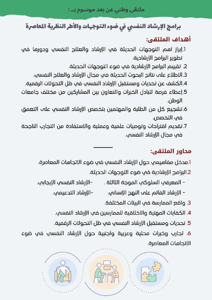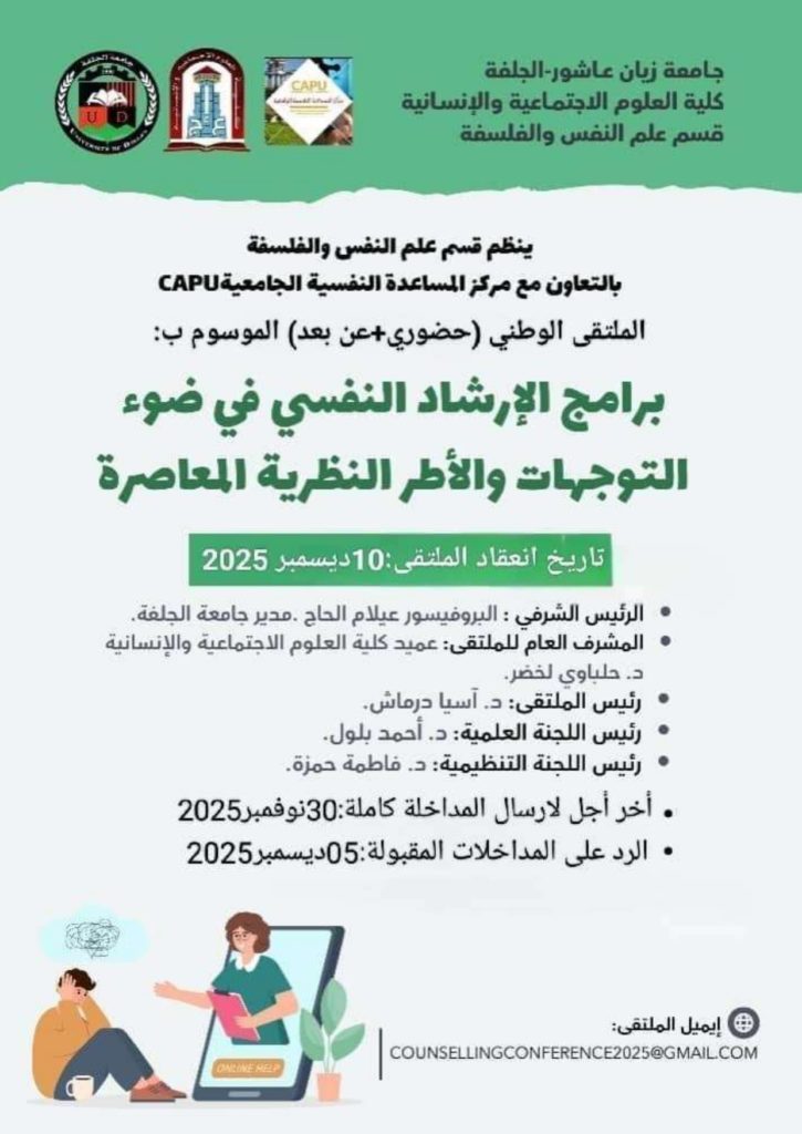 الملتقى الوطني حضوري عن بعد الموسوم بـ: برامج الإرشاد النفسي في ضوء التوجهات والأطر النظرية المعاصرة: 10 ديسمبر 2025