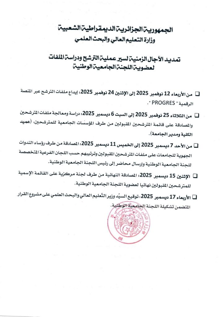 الرئيسية / الاعلانات / تمديد الأجال الزمنية لسير عملية الترشح ودراسة الملفات لعضوية اللجنة الجامعية الوطنية