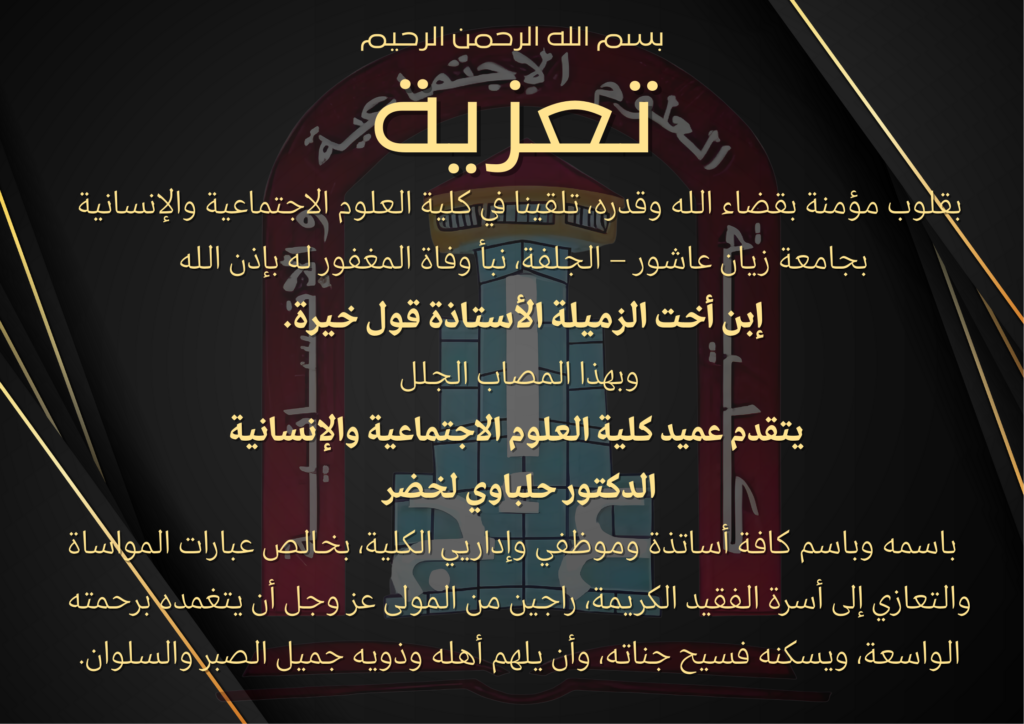 تعزية webmaster ساعتين مضت الاعلانات التعليقات على تعزية مغلقة 3 زيارة مقالات مشابهة القرار 166 – 15 نوفمبر 2025 – آلية تقييم منتج البحث والابتكار 4 أيام مضت تمديد الأجال الزمنية لسير عملية الترشح ودراسة الملفات لعضوية اللجنة الجامعية الوطنية 4 أيام مضت الموضوع : ب / برنامج منح الحكومة الصينية للعام الدراسي 2027/2026 أسبوع واحد مضت شاركها Facebook Twitter Google + Stumbleupon LinkedIn Pinterest