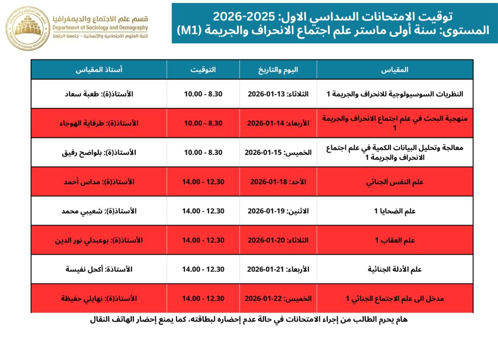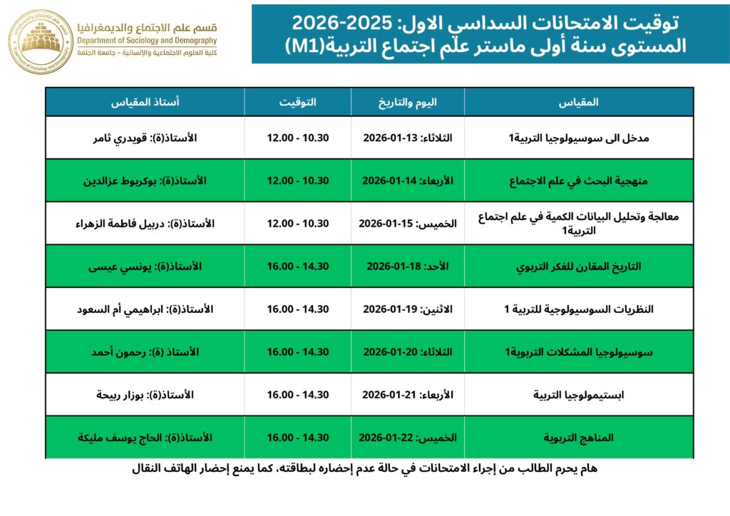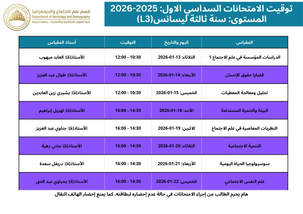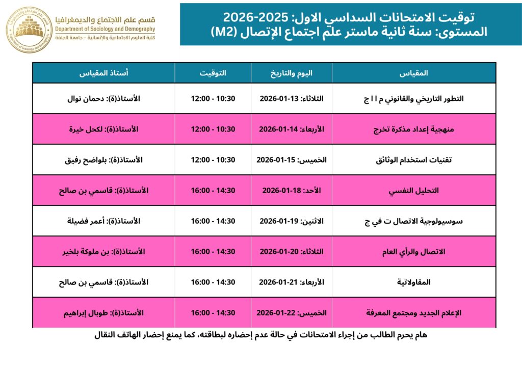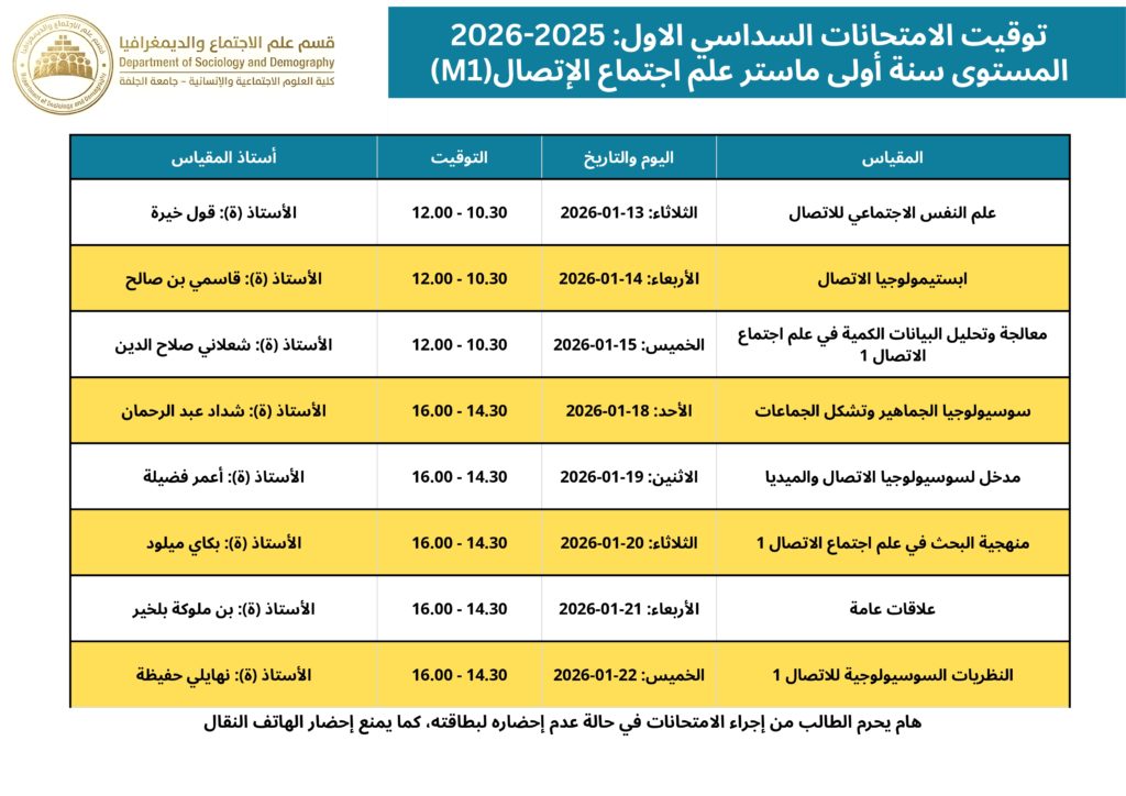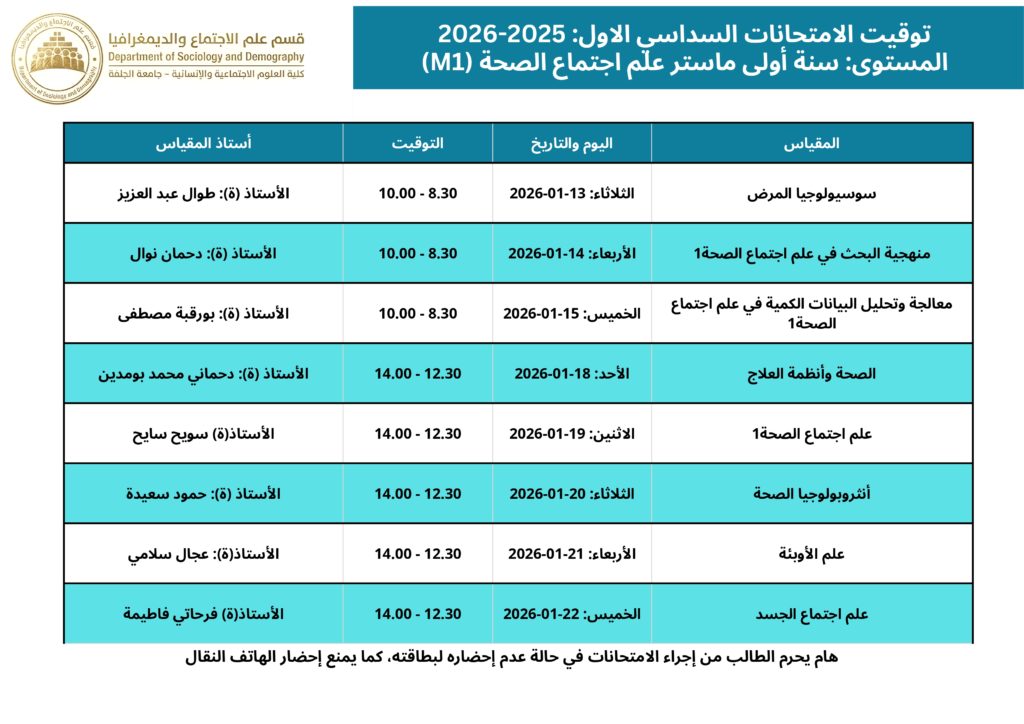 التوقيت المحين لامتحانات السداسي الأول قسم علم الاجتماع والديمغرافيا 2025 – 2026 webmaster 06-01-2026 الاعلانات التعليقات على التوقيت المحين لامتحانات السداسي الأول قسم علم الاجتماع والديمغرافيا 2025 – 2026 مغلقة 190 زيارة مقالات مشابهة إعلان للمشاركة في التظاهرات الدولية 20 ساعة مضت تهنئة بمناسبة حلول شهر رمضان المبارك 5 أيام مضت بخصوص توقيت الدراسة خلال شهر رمضان الكريم للموسم الجامعي 2026/2025 6 أيام مضت شاركها Facebook Twitter Google + Stumbleupon LinkedIn Pinterest