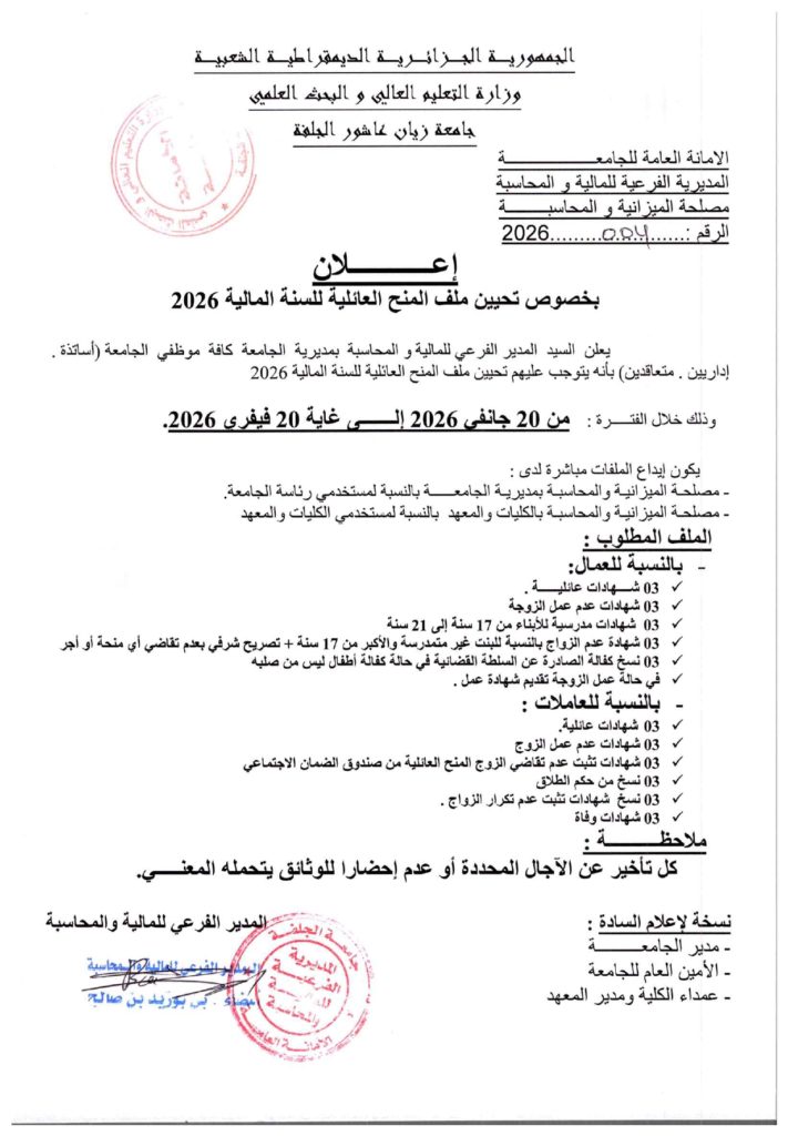 الرئيسية / الاعلانات / إعلان: بخصوص تحيين ملف المنح العائلية للسنة المالية 2026