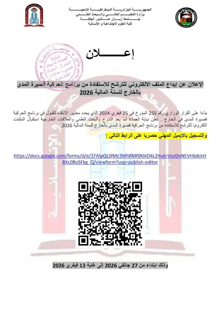 بناءا على القرار الوزاري رقم 255 المؤرخ في 25 فيفري 2024 الذي يحدد معايير الانتقاء للقبول في برنامج الحركية قصيرة المدى في الخارج . تعلن نيابة العمادة لما بعد التدرج والبحث العلمي والعلاقات الخارجية استقبال الملفات الكترونيا للترشح للاستفادة من برنامج الحركية قصيرة المدى بالخارج للسنة المالية 2026.