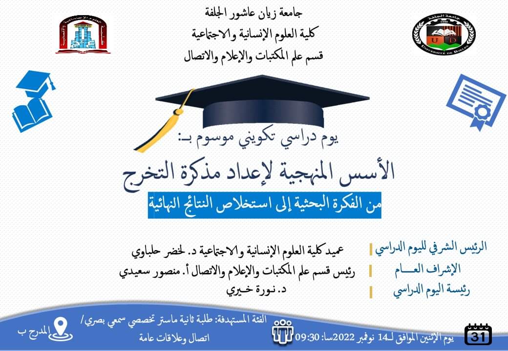 تنظم إدارة قسم علم المكتبات والاعلام والاتصال مع مخبر الدراسات التاريخية والإنسانية ندوة علمية حول: مهارات البحث عن المعلومات في البيئة الرقمية المزمع تنظيمها يوم الخميس الموافق 12 ماي 2022 على الساعة 09:30 بالمدرج _ب
